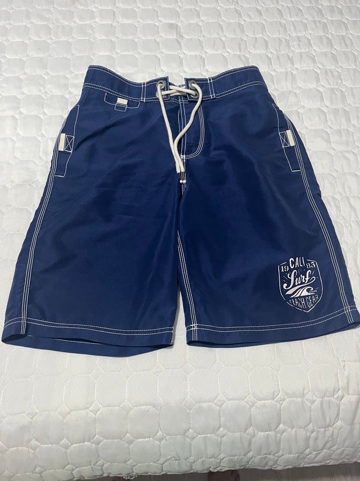 mavi erkek yüzme şortu, bol kesim ve kemerli bel ile rahatlık sağlar. Düz ve küçük logo detaylı, plaj için uygundur.