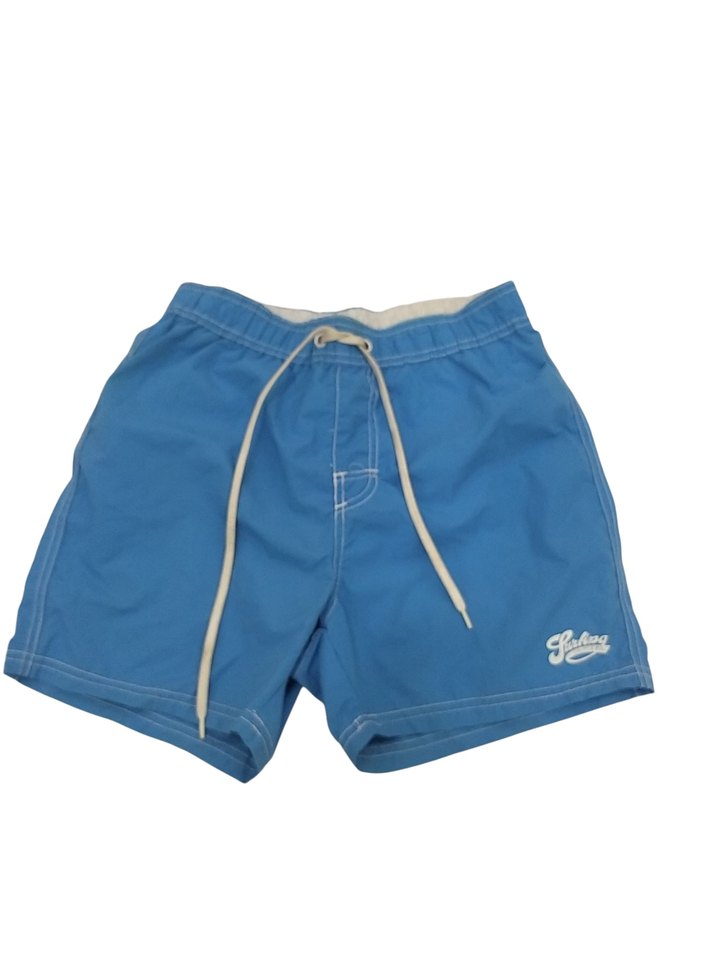 Mavi renkli, mini kesim ve bağcıklı bel detaylı, sade ve renkli erkek yüzme şortu.