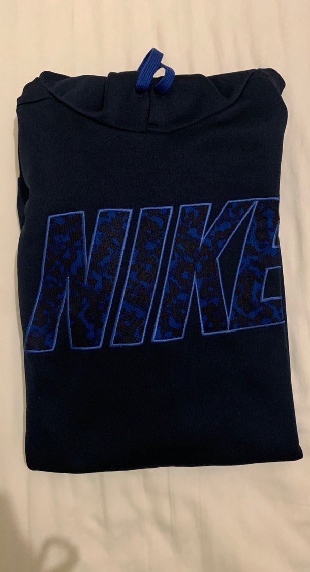 Amerikadan alındı. Mavi baskılı Nike logosu ve cırt cırt detaylı, uzun kollu, dar kesim erkek sweatshirt. Sentetik kumaştan, normal midi boyda, günlük rahat kullanım için uygun.