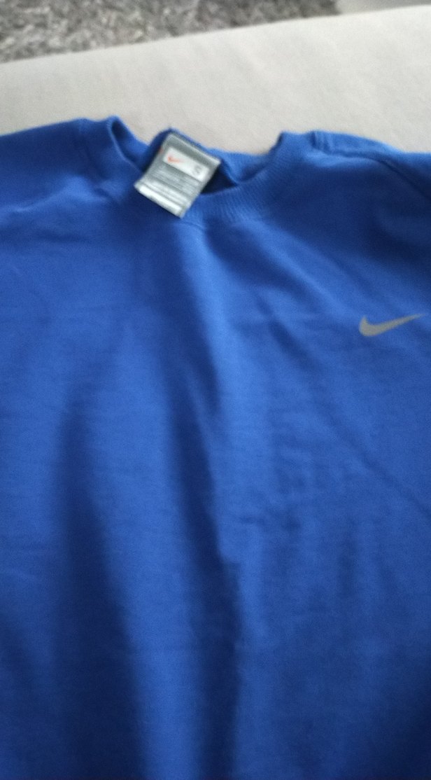 Mavi, yuvarlak yakalı Nike erkek sweatshirt. Rahat kesimi ve parlak, ipeksi kumaşıyla spor bir kere giyildi