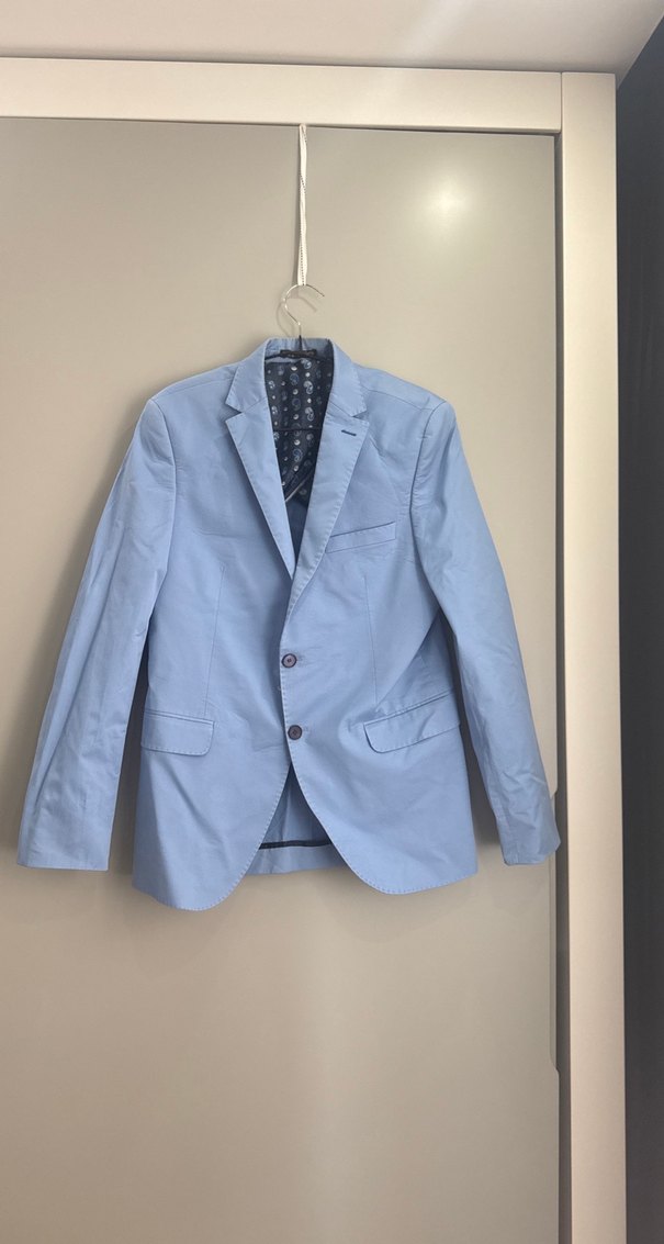 Mavi renkte, normal kesim, uzun kollu ve düğmeli erkek ceket. Ofis ortamına uygun, yakası klasik kesim ve desensiz tasarıma sahiptir.