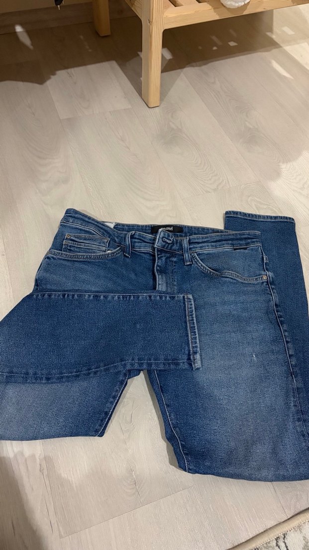 Mavi renkte, normal boyda, kemerli ve dar kot pantolon. Günlük kullanıma uygun, sade ve trend görünümlü.