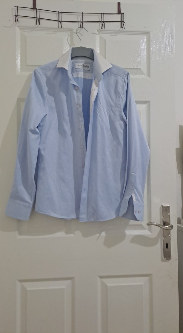 Pamuklu kumaştan yapılmış, mavi renkli, uzun kollu ve düğmeli yakalı erkek gömleği. Ofis kullanımı için uygun, normal kesim ve midi boyda.