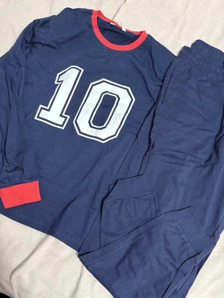 Erkek pijama takımı, uzun kollu ve bisiklet yaka detaylıdır. Mavi üstte 10 sayısı baskısı ve kırmızı yakalık ile manşetler bulunur. Rahat ve şık tasarıma sahiptir.