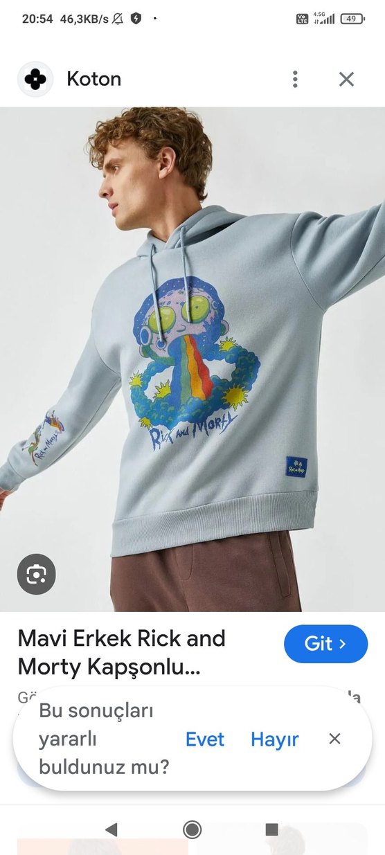Uzun kollu, bol kesim ve bisiklet yaka mavi erkek sweatshirt. Yumuşak fleece kumaştan yapılmış ve önünde renkli Rick and Morty baskısı bulunur.