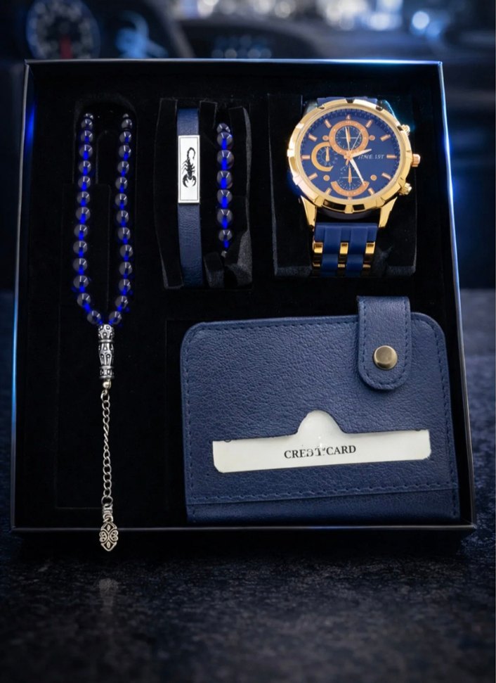 Mavi erkek saat, uyumlu bileklik, tesbih ve 'CRESSCARD' yazılı kartlıklı mavi cüzdan içeren set. ⌚