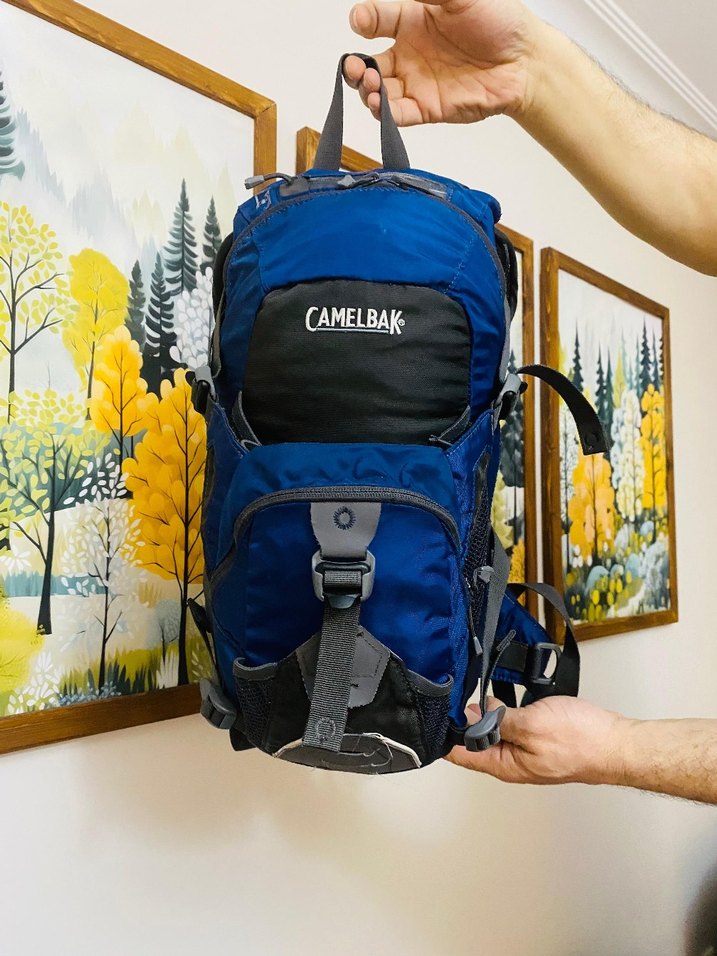 Koyu mavi renkte, tokalı ve baskılı desenli erkek sırt çantası. Önünde CAMELBAK logosu bulunur, trend sokak tarzına uygundur.