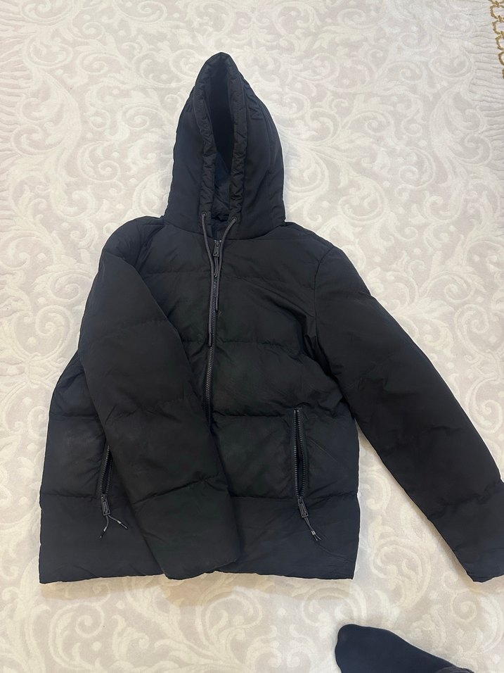 Mavi S beden Erkek siyah kapüşonlu mont , uzun kollu ve rahat kesimlidir. Günlük kullanıma uygun sade ve sıcak tutan tasarımı vardır. defolu