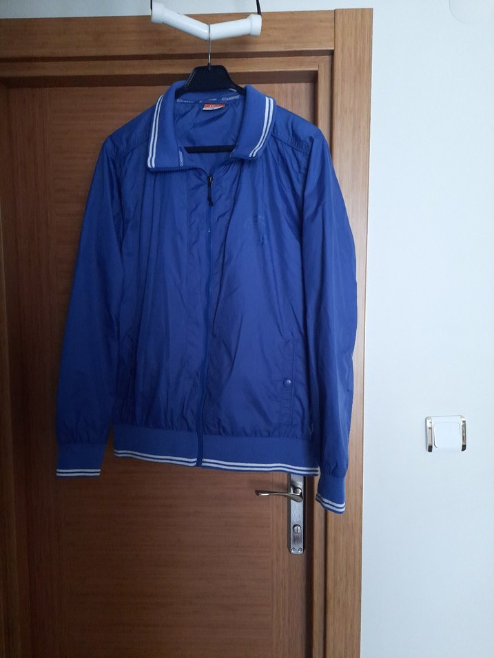 Mavi parlak sentetik kumaştan erkek spor rüzgarlık, bol kesim, uzun kollu ve fermuarlıdır. Günlük rahat kullanıma uygundur. ️
