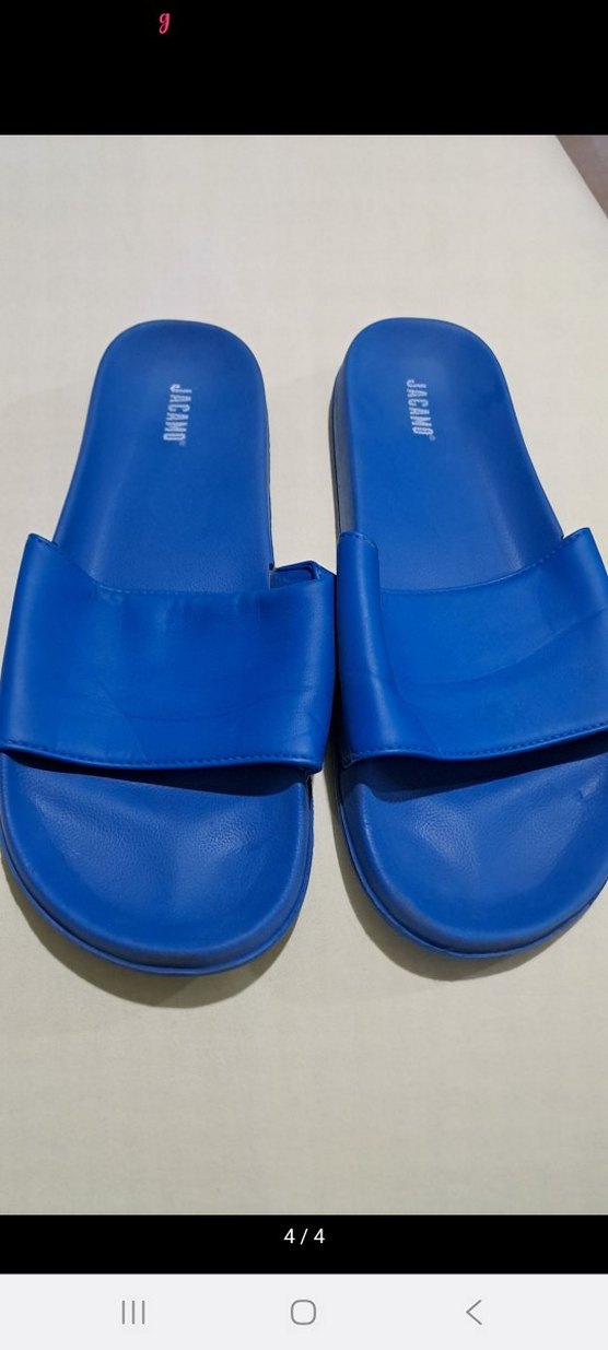 Parlak mavi kauçuk malzemeden yapılmış, desen içermeyen minimalist erkek spor terlik. Sokak stili ve spor için rahat ve şık. 46 numara