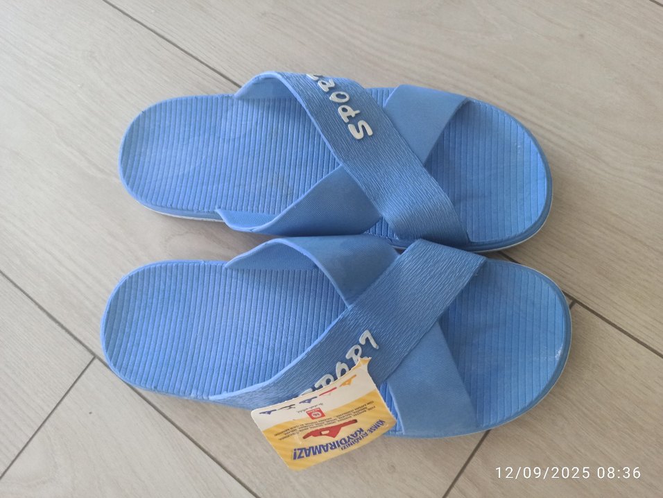 Mavi renkli, velcro bantlı, kauçuk malzemeden yapılmış erkek spor terliği. Sade tasarımıyla günlük kullanıma uygundur.