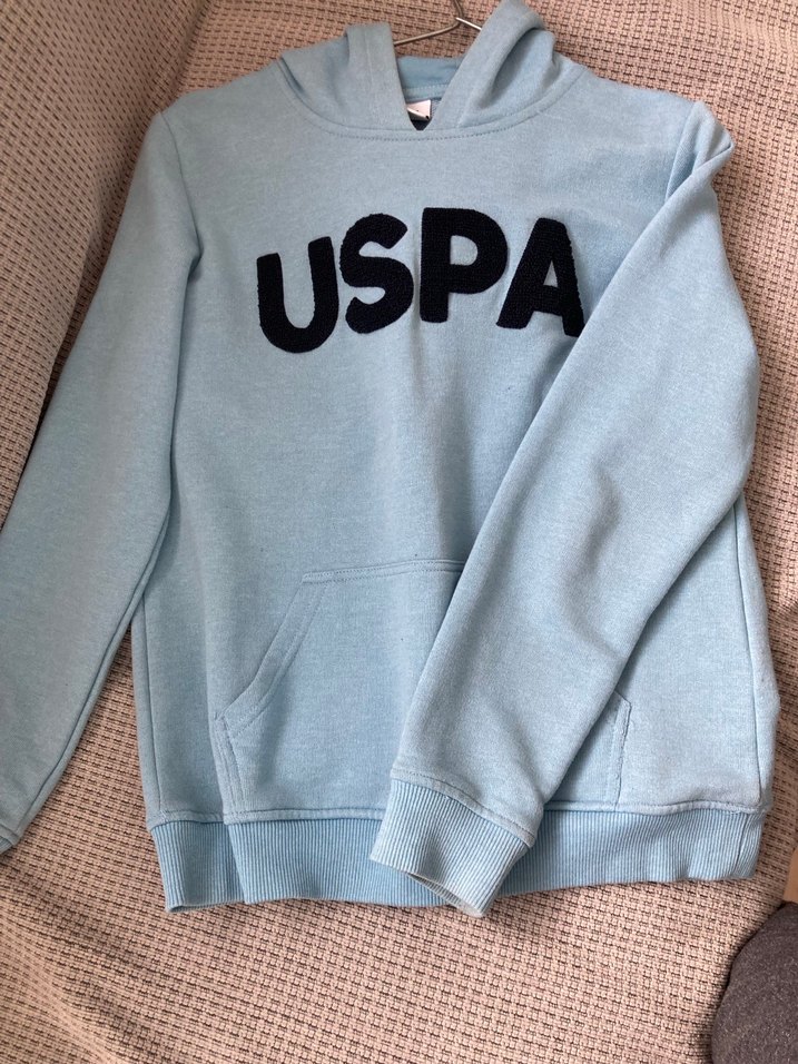 Pastel mavi renkte, uzun kollu ve kapşonlu yakalı sweatshirt. Yumuşak ve sıcak kumaştan üretilmiş, göğsünde siyah USPA nakışlı. Rahat ve salaş kesim.