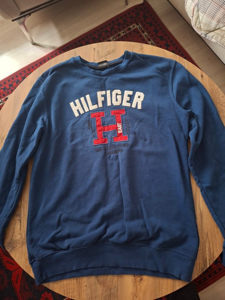 Mavi renkli, uzun kollu, bisiklet yaka erkek sweatshirt. Önde 'HILFIGER' baskılı, rahat ve oversize kesim, yumuşak ve sıcak kumaştan üretilmiştir.