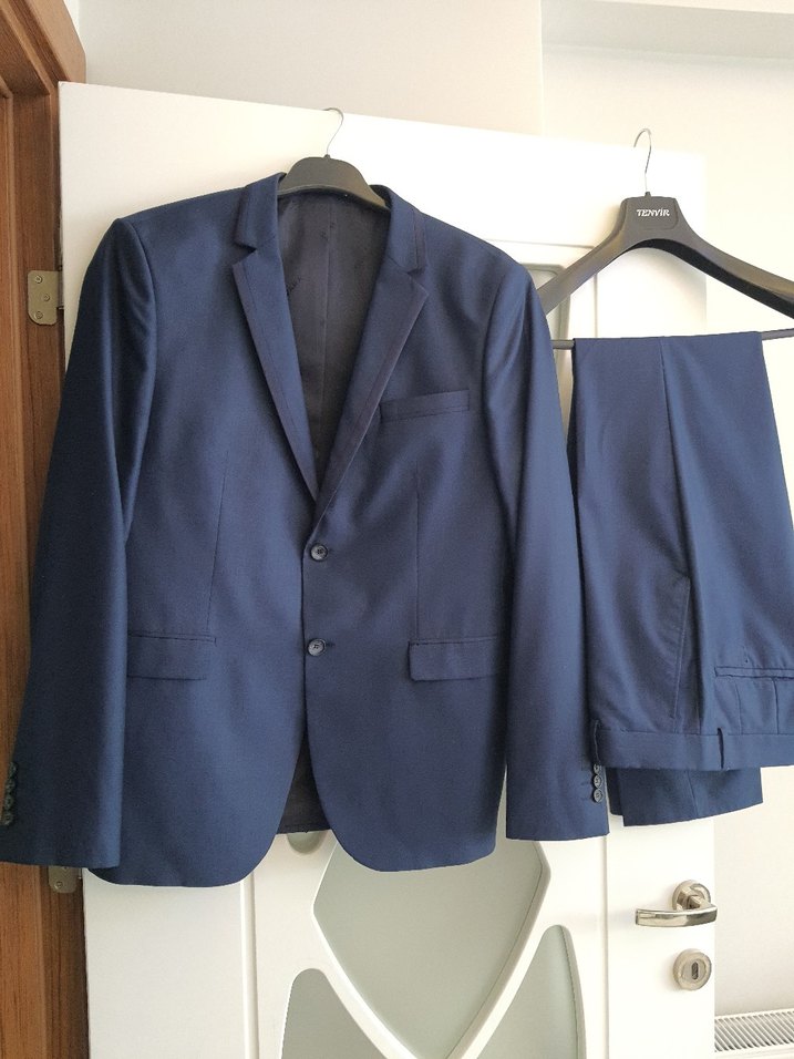 Mavi renkli, düğmeli ve uzun kollu erkek takım elbisesi. Modern klasik tarzda, normal boyda ve ofis kullanımı için uygun, klasik şıklık sunar.52-6drop Ceket gogus 53cm Pantalon bel 47cm