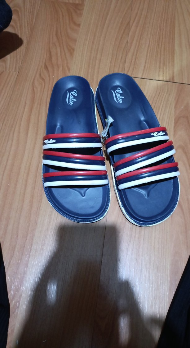 Koyu mavi renkte, kauçuk tabanlı ve Velcro bantlı erkek terlikleri. Günlük rahatlık ve şık sokak stili için uygundur.