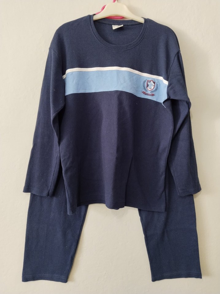 Uzun kollu, bisiklet yaka ve bol kesim erkek pijama takımı. Koyu mavi renk, açık mavi şerit ve küçük arma detaylı, rahat athleisure tarzında.ust genişlik 50 cm uzunluk 64 cm alt uzunluk 93 cm