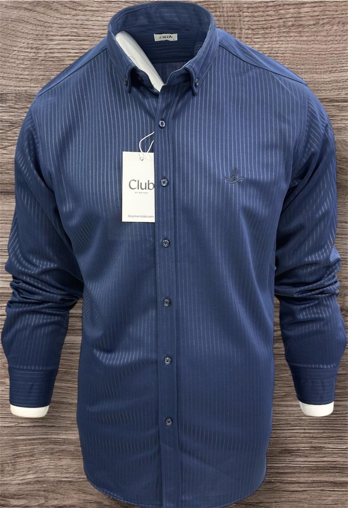 Mavi renkli, uzun kollu, yakalı ve düğmeli erkek gömleği. Sentetik kumaş üzerinde ince desenli, ofis ve günlük sokak stili için uygundur. Regular fit ve normal boyda.