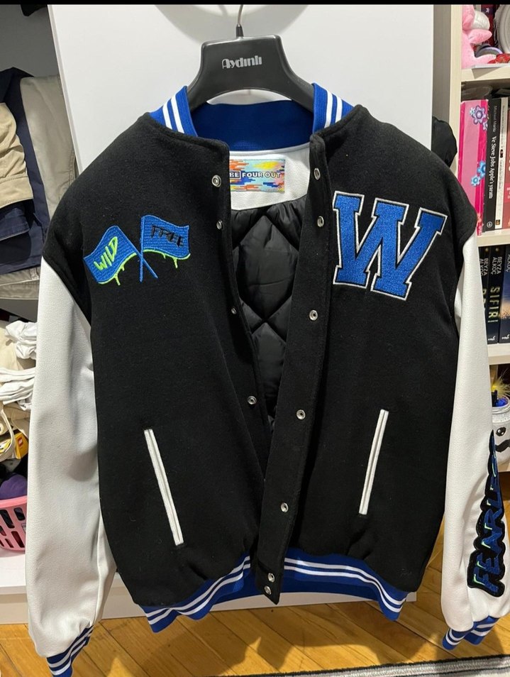 erkeller için mavi ve beyaz renklerde, baskılı detaylı, uzun kollu, düğmeli ve cırt cırtlı spor bomber ceket. Rahat kesimli ve orta boy uzunluktadır. yurtdışından geldi hiç giyilmedi
