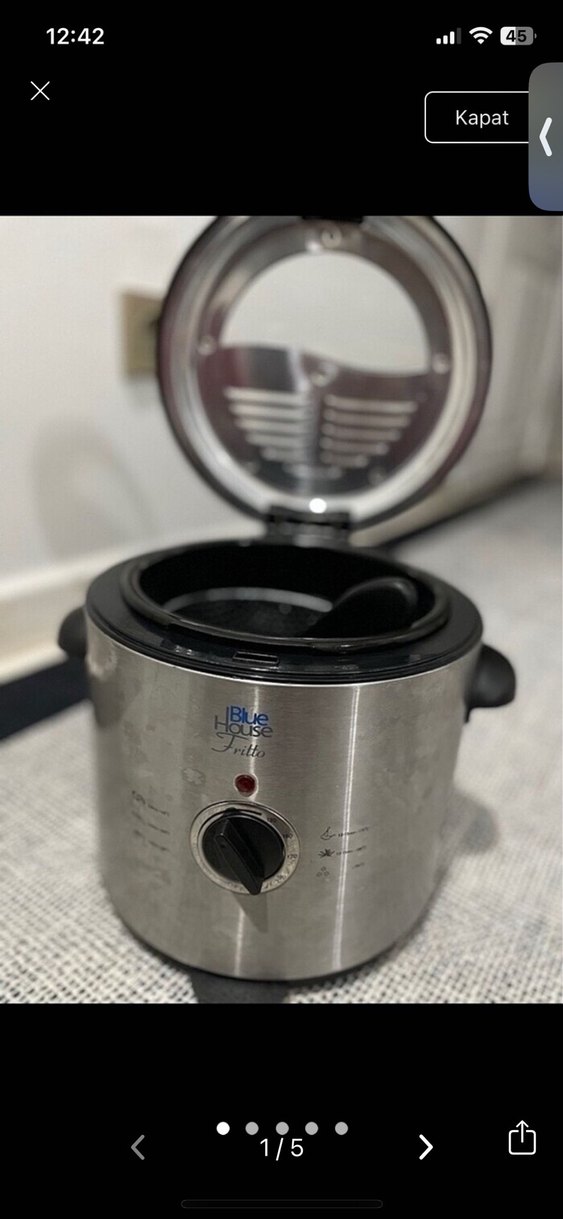 Hiç kullanmadım sıfır. Blue House fritözü gri gövdeye, mavi logoya, ayar düğmesine ve şeffaf kapağa sahiptir.