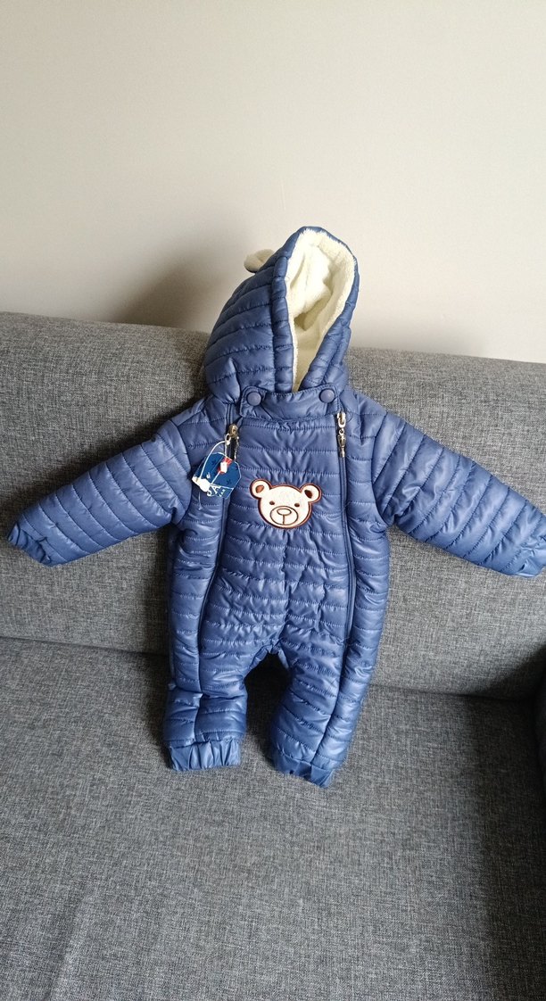 Yumuşak kürklü astarlı, fermuarlı mavi bebek kayak tulumu. Sokak tarzı için uygun, sıcak tutar. Küçük geldiği için hiç giyilmedi.