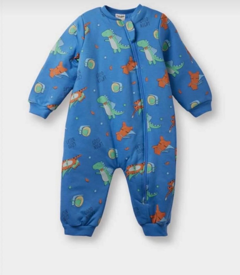 Uzun kollu, yuvarlak yakalı, fermuarlı bebek tulumu. Yumuşak ve sıcak kumaştan, renkli dinozor desenli mavi tulum. Uyku tulumu