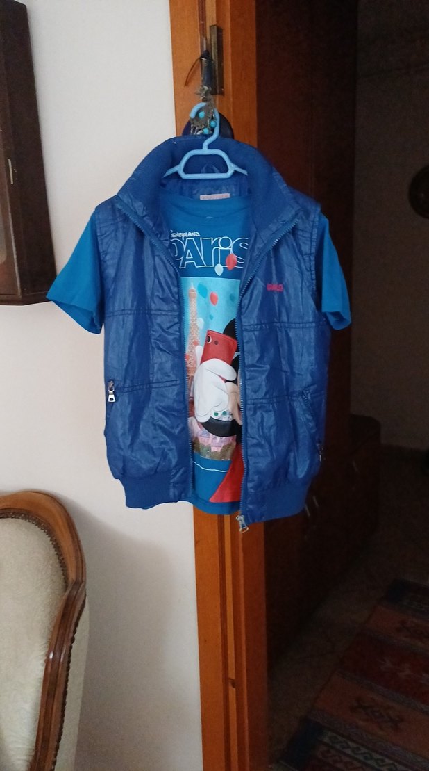 Yumuşak kürk dokusunda, parlak mavi renkli, fermuarlı cepli, yüksek yakalı ve dar kesim çocuk yeleği. Altında baskılı kısa kollu tişörtle uyumlu.