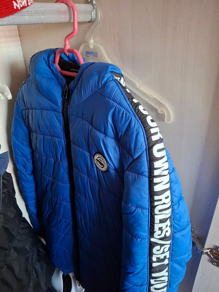 Fermuarlı, çentikli yaka ve parlak mavi renkte, baskılı detaylara sahip erkek çocuk montu. Trend sokak stili için uygun.