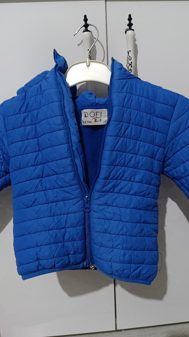 Fermuarlı, bisiklet yaka, mavi renkli, yumuşak ve sıcak kumaştan erkek çocuk montu. Düz ve desen içermeyen, sokak stiline uygun model.