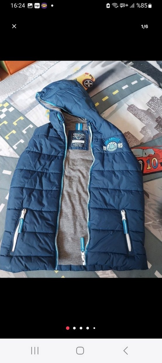 Yumuşak ve sıcak kumaştan, fermuarlı cepli, yüksek yakalı mavi erkek çocuk şişme yelek. Gri iç astarlı, desen içermeyen, trend sokak tarzı için uygun.
