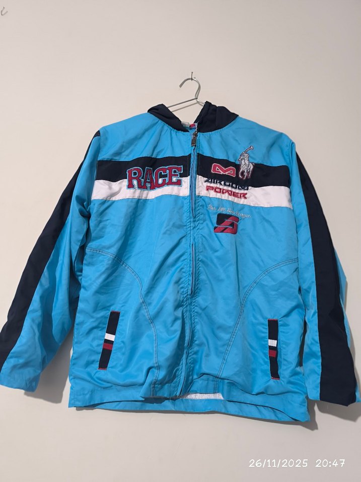 Fermuarlı, parlak mavi renkli, notched lapel yakalı, sokak tarzı erkek çocuk ceketi. Yumuşak ve sıcak kumaştan, RACE markalı.