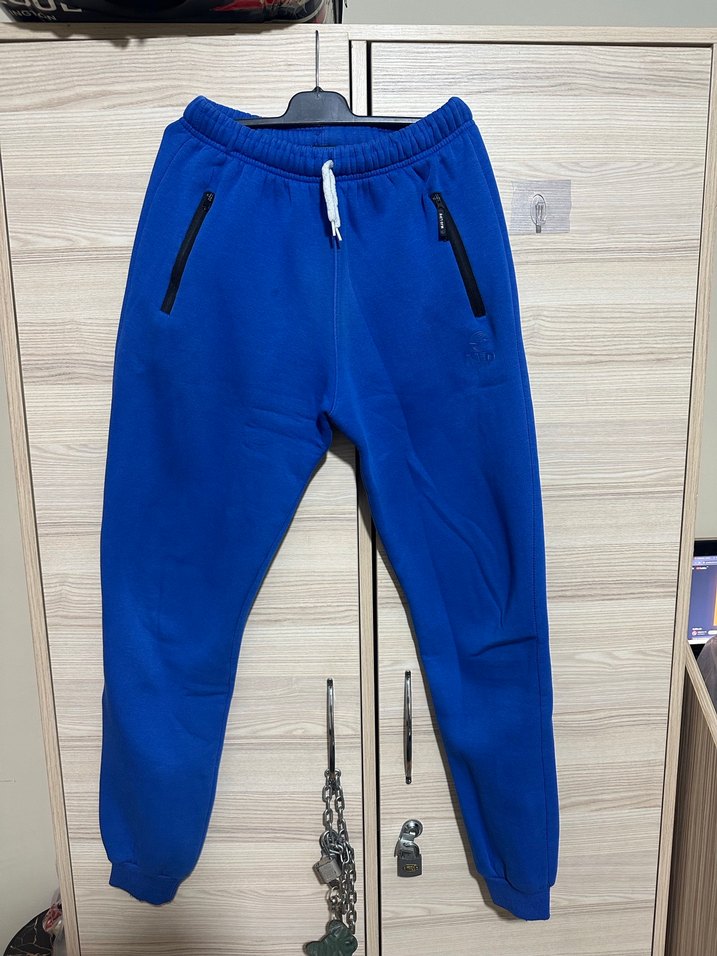 Yumuşak kumaştan, fermuarlı ceplere sahip, bol kesim mavi erkek eşofman altı. Spor ve günlük kullanıma uygundur.Dolapda katlı durduğu için iz gözüküyor ama az kullanıldı temiz ürün
