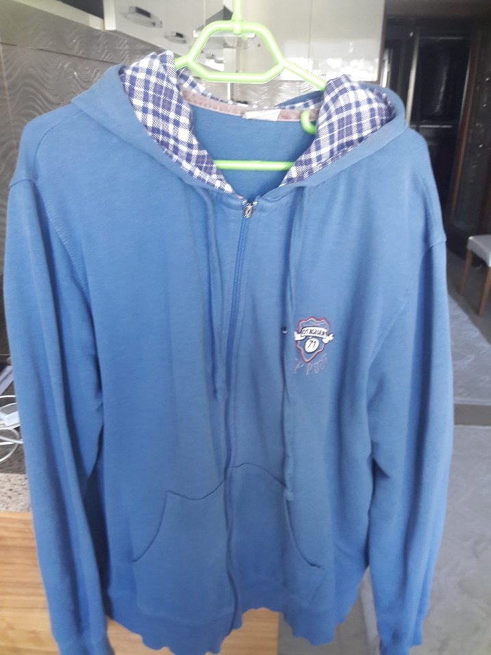 Mavi renkli, fermuarlı erkek sweatshirtü uzun kollu ve yuvarlak yakaya sahiptir. Rahat kesimi, baskılı detayları ve kareli kapüşon astarıyla gündelik şıklık sunar.