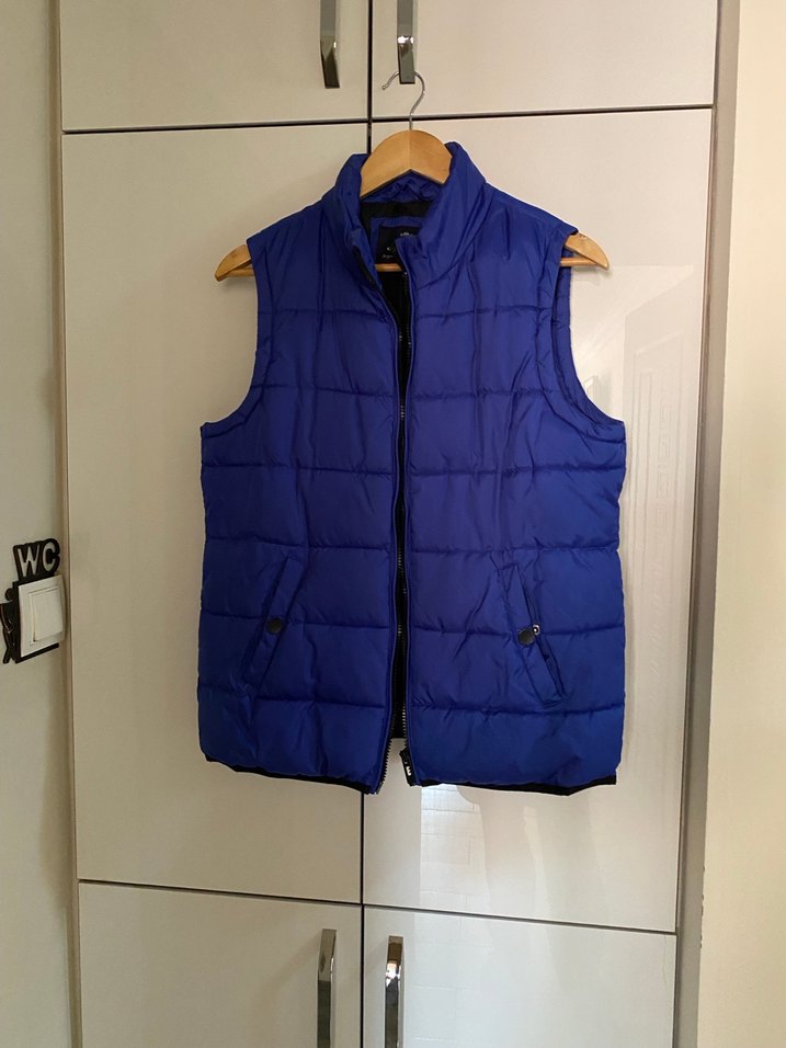 Fermuarlı, yüksek yakalı, mavi ve şişme erkek yelek. Yumuşak ve sıcak kumaştan, günlük rahat kullanıma uygun normal boyda. Trend sokak stili için ideal.