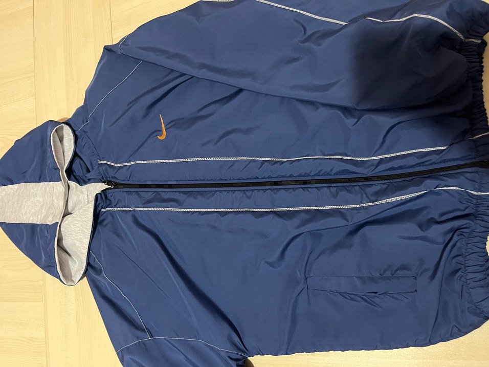 Parlak sentetik kumaştan yapılmış, fermuarlı ve uzun kollu, notched lapel yakalı, normal midi boyda, erkek spor ve sokak tarzı için uygun dar kesim mavi yağmurluk. Zamanında bir butikten alınmıştı. Kolunda ufak bir leke var pek belli olmuyor giyince. Standart kalıp oversizedır