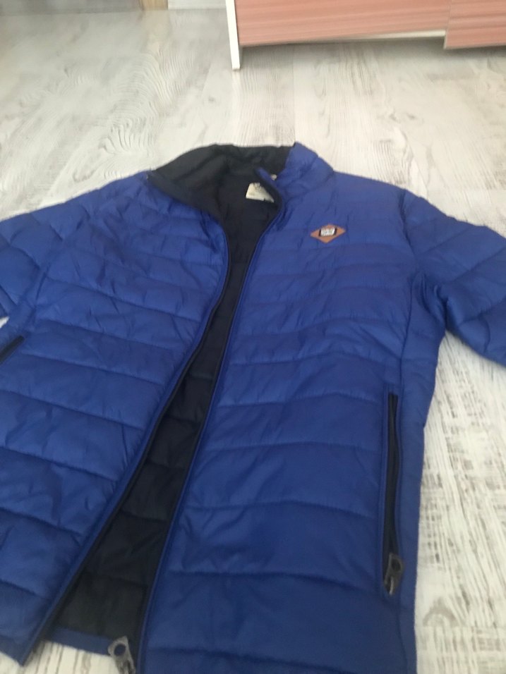 Mavi parlak renkte, fermuarlı ve cepli, uzun kollu, notched lapel yakalı, erkeklere özel dar kesim street wear mont. Dış mekan kullanımı için uygun yumuşak ve sıcak kumaş.
