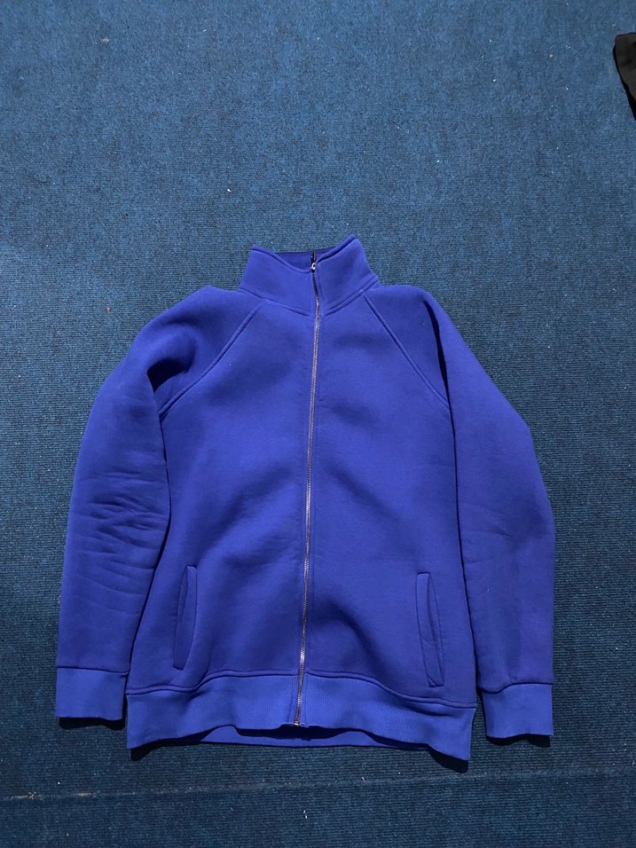 Mavi renkli, fermuarlı, yüksek yakalı erkek sweatshirt. Uzun kollu, dar kesimdir 3 iplik kumaştır