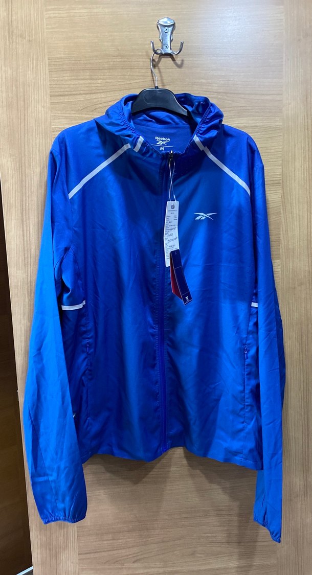 Parlak mavi renkte, fermuarlı erkek yağmurluk. Uzun kollu, bol kesim ve çentikli yaka detayına sahip, sentetik kumaştan üretilmiştir.