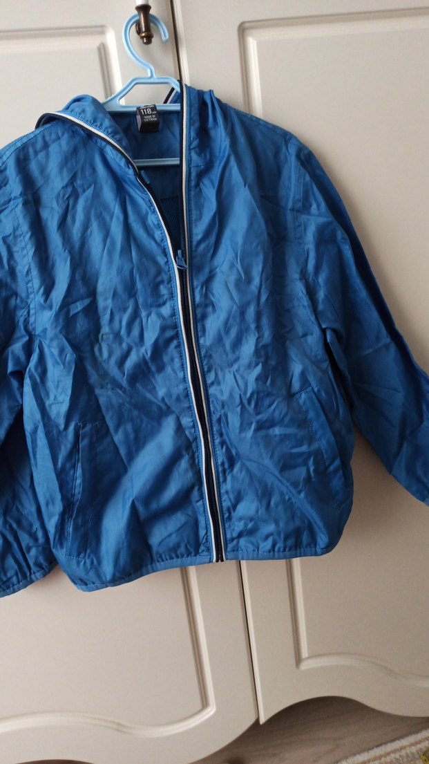 Parlak sentetik kumaştan yapılmış, fermuarlı ve kesimli erkek çocuk yağmurluğu. Notch yakalı, sade ve sokak stili.