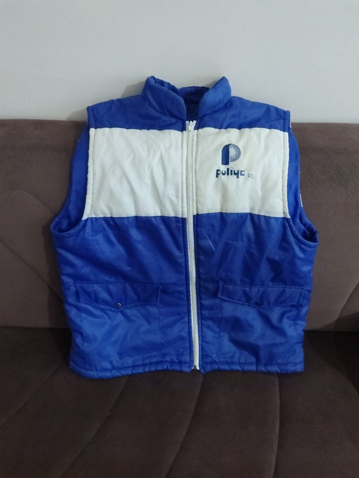 Fermuarlı, mavi-beyaz renklerde, baskılı 'Foliyc' logosu bulunan, atlet kesim ve normal boyda günlük kullanıma uygun erkek yeleği.