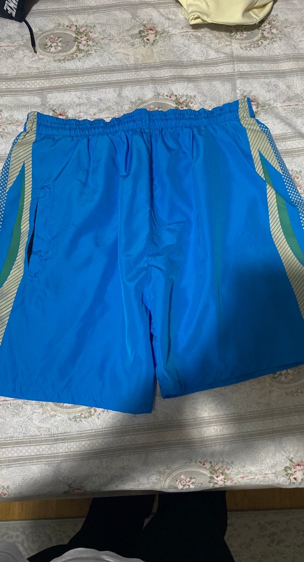 Mavi, fermuarlı cepli, parlak görünümlü, normal boy midi erkek yüzme şortu. Dış mekan kullanımı için uygun, sade ve athleisure tarzında.