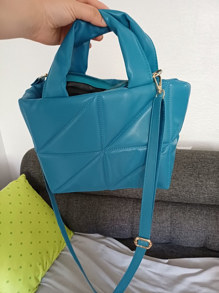 Pastel mavi renkte, fermuarlı ve ayarlanabilir askılı sentetik kumaş kadın çanta. Sokak stili ve günlük kullanım için uygundur.
