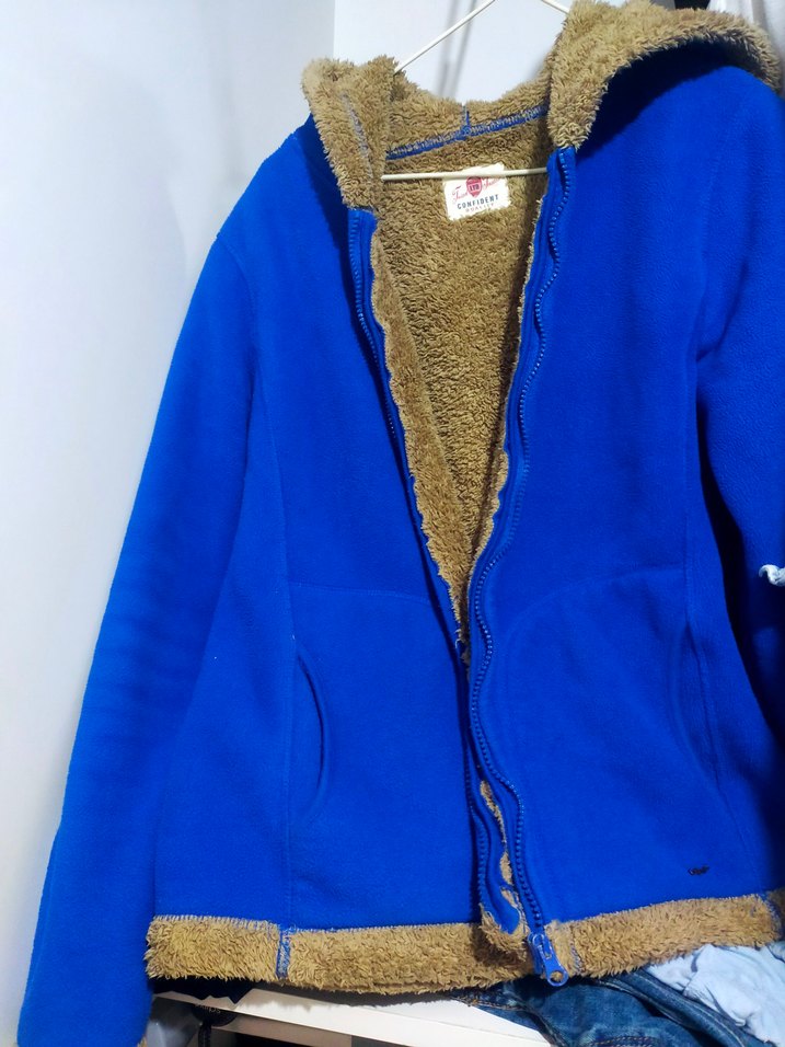 Parlak mavi, fermuarlı ve uzun kollu kadın ceketi, yaka detayı ve içi yumuşak dokulu rahat kumaşla kaplıdır. Günlük sokak stili için uygundur.