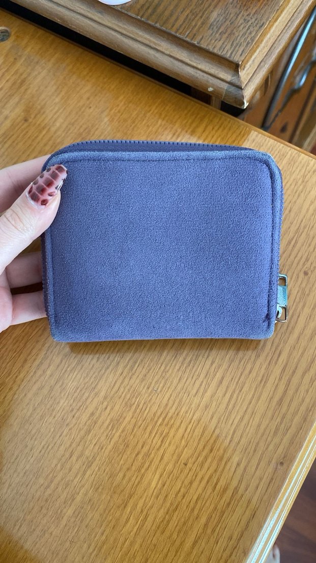 Yumuşak, kürk dokulu mavi kadın cüzdanı, fermuarlı kapanışa sahip, günlük kullanım için sade ve bohem tarzda.