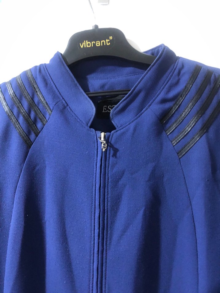 Kapalı yaka, uzun kollu ve fermuarlı, şık mavi renkli kadın tesettür ferace omzu vatkalı rahat ve şık tarz için uygun.kusuru yoktu belden oturtmalıdır