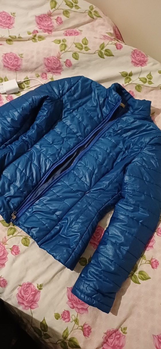 Mavi, parlak renkte, fermuarlı ve dar kesimli kadın kışlık mont. Sentetik kumaştan, normal midi boyunda, kesik yaka ve sokak stili için uygun.