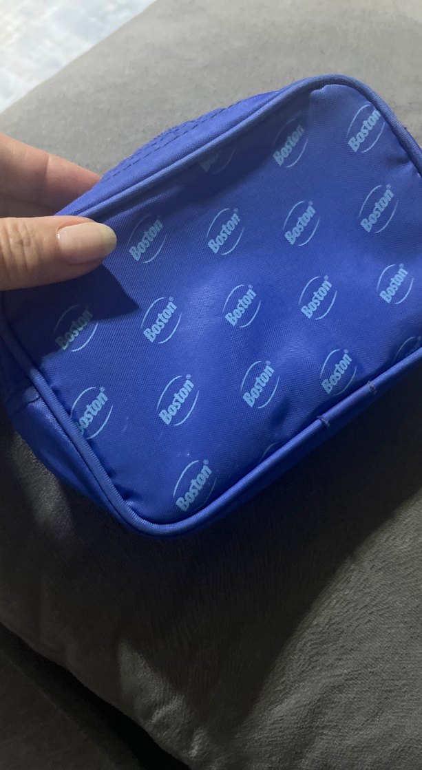 Fermuarlı mavi makyaj çantası, sentetik kumaştan üretilmiş ve Boston baskılı desenlidir. Günlük ve iş stiline uygun parlak yüzeye sahiptir.