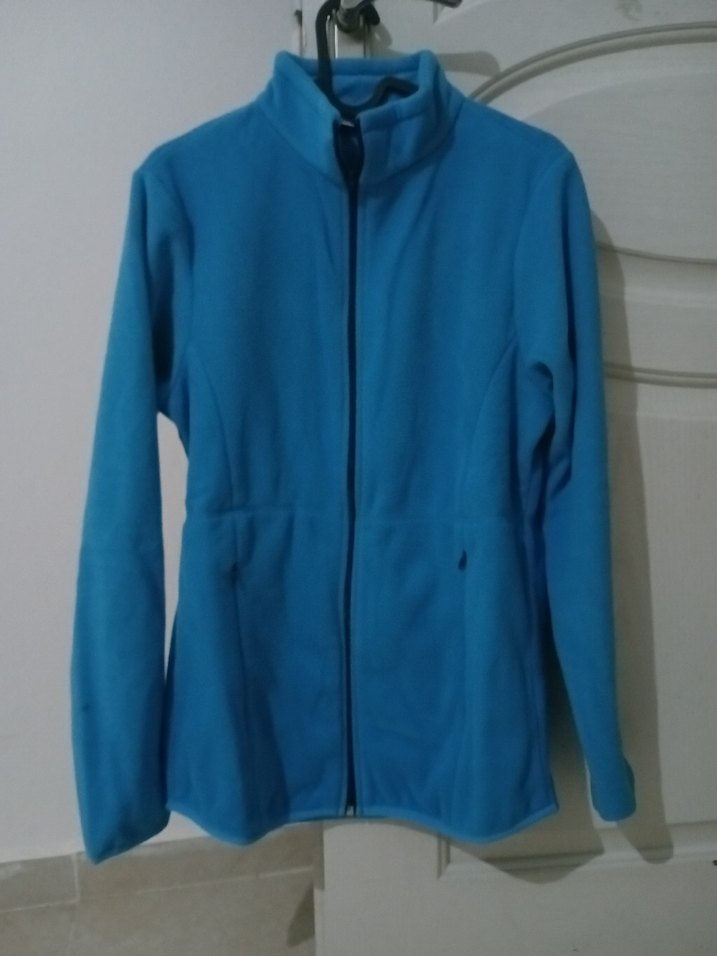 Fermuarlı, uzun kollu, yüksek yakalı mavi kadın polar ceket. Günlük kullanım için uygun, sade ve renkli tasarım.