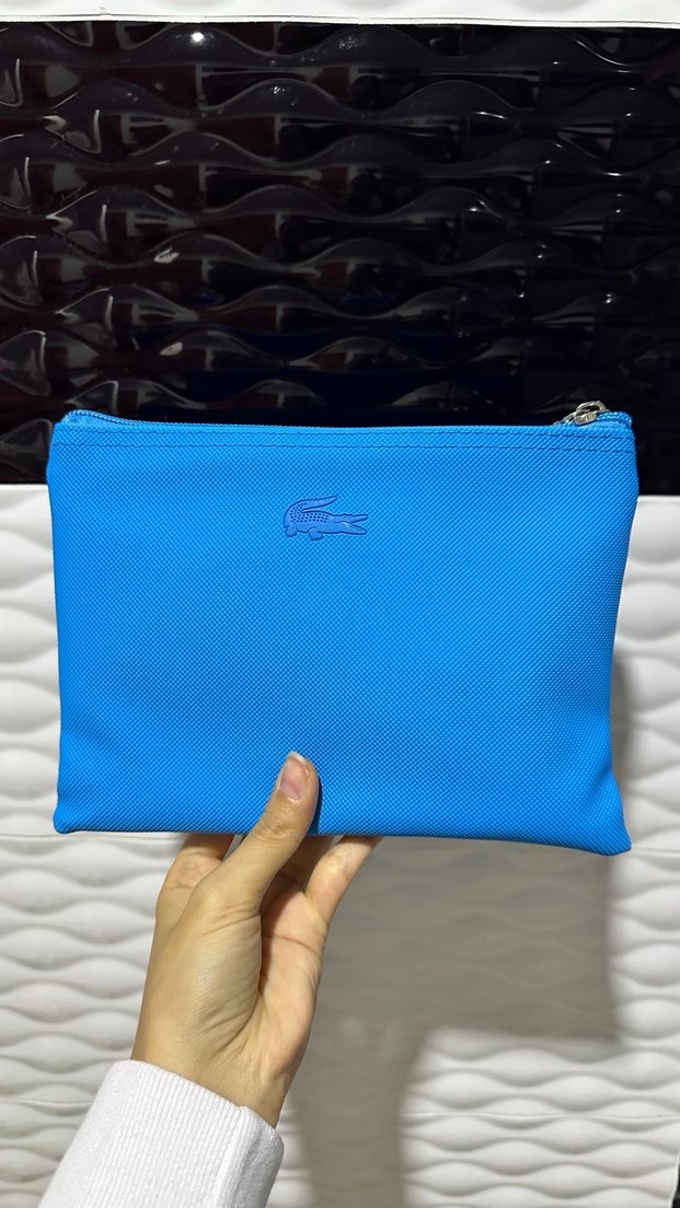 Lacoste Mavi renkli, fermuarlı ve plastik malzemeden yapılmış kadın portföy çanta. Günlük kullanıma uygun, trend sokak stili ile uyumlu sade tasarım. İçerisinde uyku bandı, çorap, kulak tıkacı, diş fırçası, diş macunu vardır. Yeni ve etiketlidir.