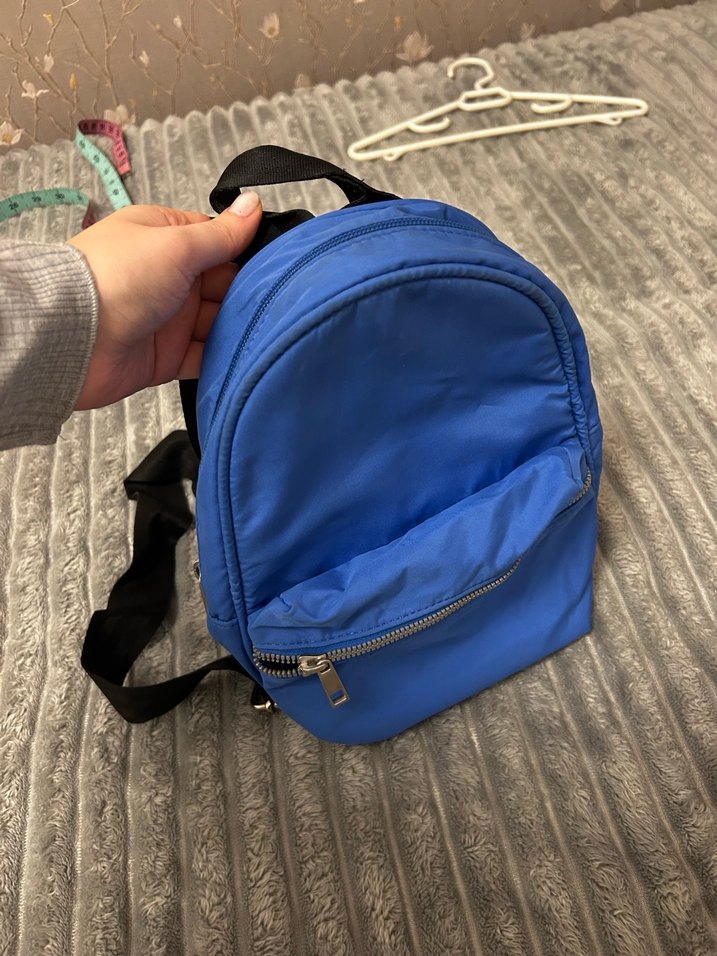 Mavi renkli, fermuarlı bölmeleri olan, sentetik kumaştan yapılmış sade ve minimalist kadın sırt çantası.
