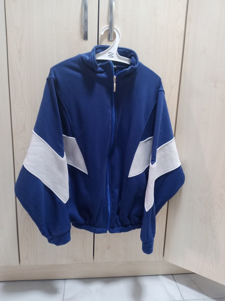 Yüksek yakalı, uzun kollu, bol kesim mavi ve beyaz detaylı fermuarlı kadın spor ceketi. Az giyilmiş herhangi bir sorunu yok.